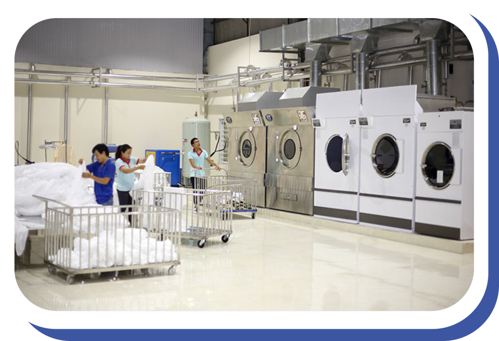 Công ty đầu tư hệ thống máy giặt – sấy – là hơi công suất lớn, vận hành theo quy trình khép kín, phân loại riêng và kiểm soát nghiêm ngặt, đảm bảo tiêu chuẩn vệ sinh, an toàn và phòng ngừa nhiễm chéo. Đội ngũ nhân sự được đào tạo bài bản, có kinh nghiệm thực tiễn trong xử lý khối lượng lớn và yêu cầu cao về chất lượng.